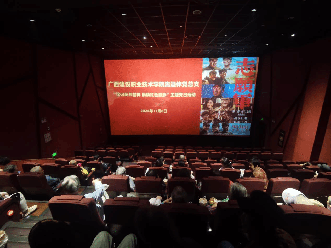 广西建院11月14日讯(工会 黄军萍)为重温峥嵘岁月,赓续红色血脉,弘扬爱国主义精神,增强党员的历史使命感和责任感,11月8日,学校离退休党总支组织全体党员到永恒晶钻IMAX影城观看红色电影《志愿军:存亡之战》。银幕上的一幕幕场景仿佛历史的低语,战争的惨烈和悲壮深深震撼着每个人的内心。光影交错间,历史的回响仿佛就在耳边,家国情怀的炽热让人动容。影片中志愿军将士不屈不挠、舍生取义的战斗精神深深感动了在场的同志,数度潸然泪下。...
