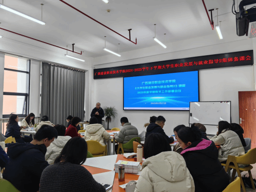 广西建院3月3日讯(招生就业处 练翠滢)为切实提升《大学生职业规划与就业指导》课程的教学质量,确保教学内容与学生实际需求紧密对接,首页于2月27日在行政副楼410室组织了集体备课会。该课程团队的全体教师参与会议,共同为新学期的教学工作做足准备。会上,招生就业处晏毅副处长介绍了学生目前整体就业形势,强调教师要根据就业环境形势的变化及时调整和更新授课内容,既要引导学生在本专业中进行充分的职业可能性探索,又要引导学生树立“...