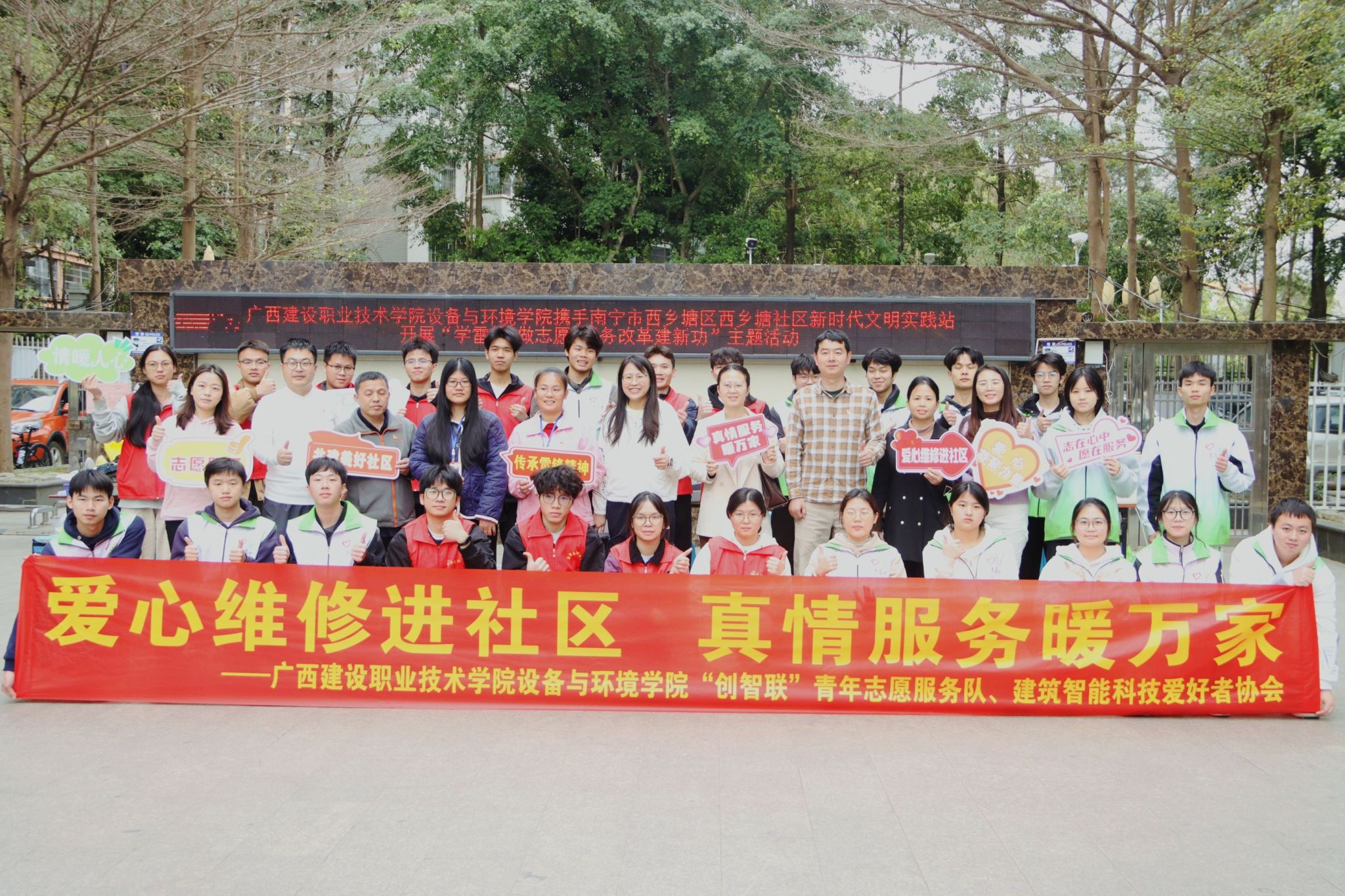 广西建院3月30日(设备与环境学院 文/农静芳 徐静 图/谭晓颖 李兆健)近日,设备与环境学院团总支携手西乡塘社区到金龙公寓社区开展“爱心维修进社区,真情服务暖万家”学雷锋志愿服务活动,28名大学生志愿者怀揣着满腔热忱前往金龙公寓社区开展义务维修志愿服务活动,设备与环境学院教工党支部、学生党支部党员代表也一同前往参加活动。活动当天,西乡塘社区书记黄丽晓对设备与环境学院青年志愿服务队的到来表示了热烈的欢迎,在活动现场,...