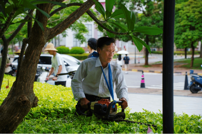 人物简介:袁江春,后勤管理处(安全保卫处)绿化养护员,主要负责植物养护与环境美化、绿化设施的维护与管理等工作。日常工作,是对校园内的花草树木进行精细化养护,包括根据季节和植物特性合理浇水、施肥,定期修剪枝叶以保持美观造型,并及时防治病虫害,确保植物健康生长;定期检查维护喷灌系统、绿篱修剪机、高压打药机等绿化设施,保障设备正常运行;在校园举办大型活动或节日期间,根据需求布置花卉景观,营造良好的校园氛围。...