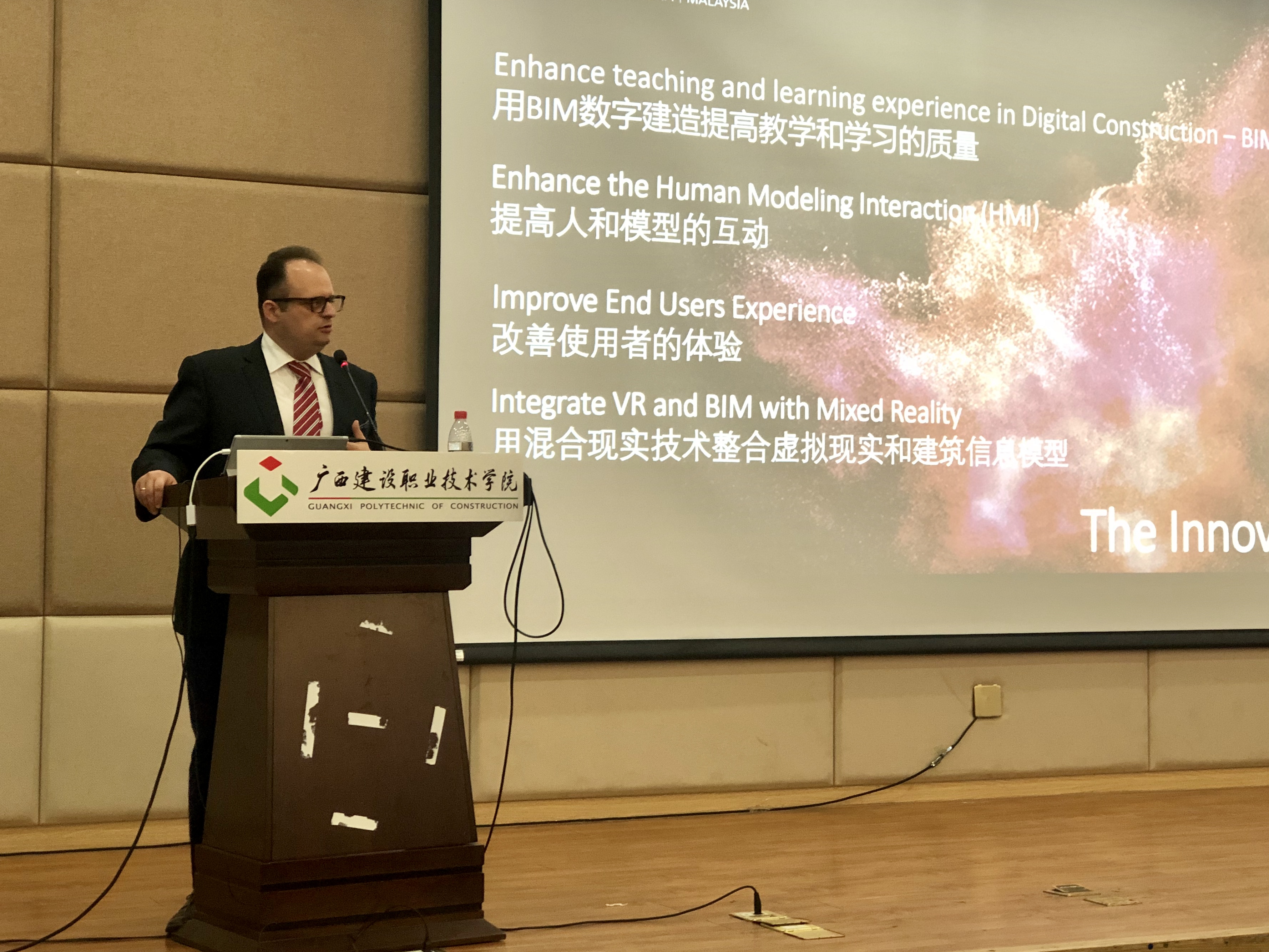 广西建院5月26日讯(教务科研处 谢泽芸)为开阔首页师生视野,提高科研水平,5月25日,宁波诺丁汉大学乔治斯·卡普吉尼斯博士应邀来首页分别作《BIM技术前沿与标准、公共数据环境和其他可视化技术如何提升学生就业竞争...