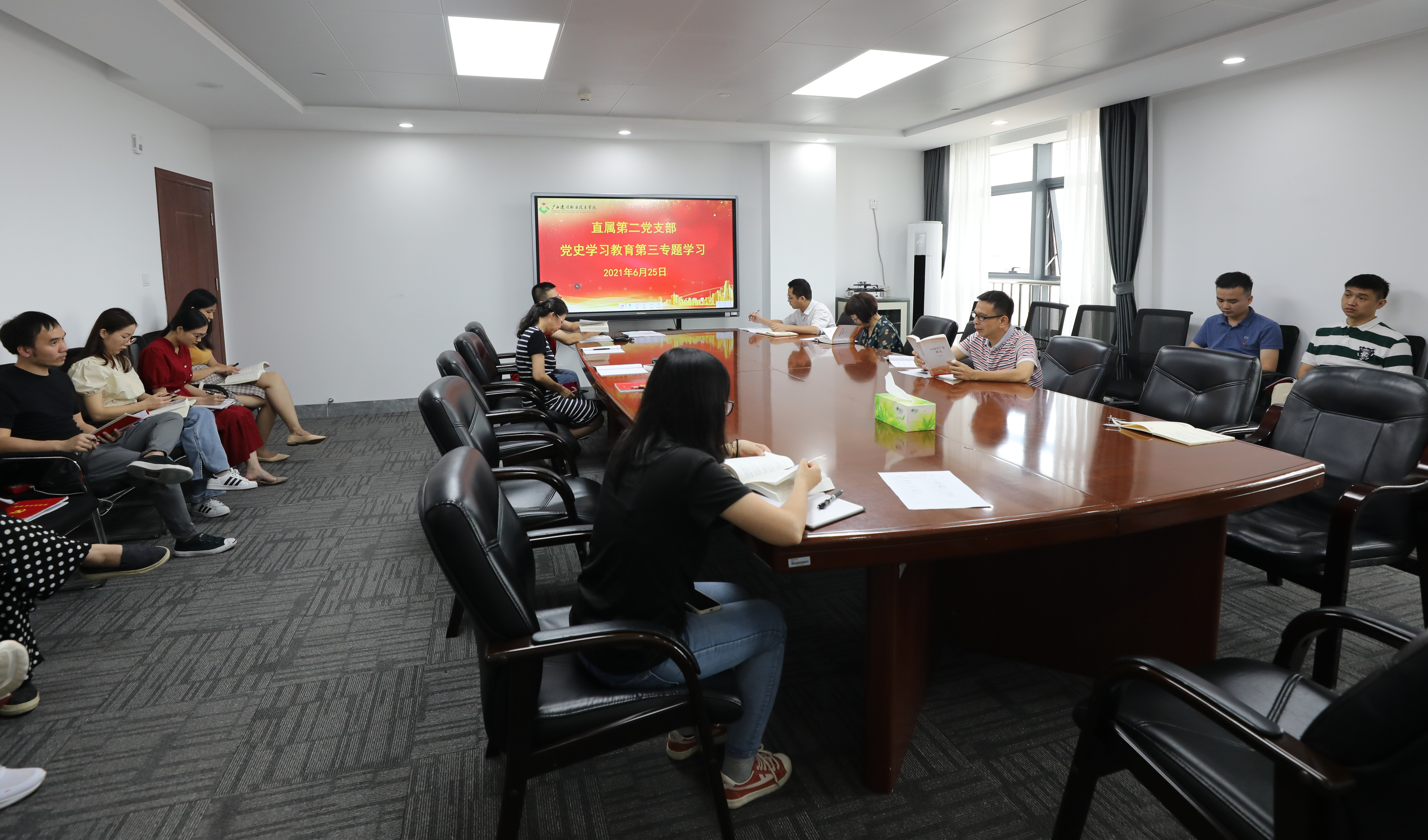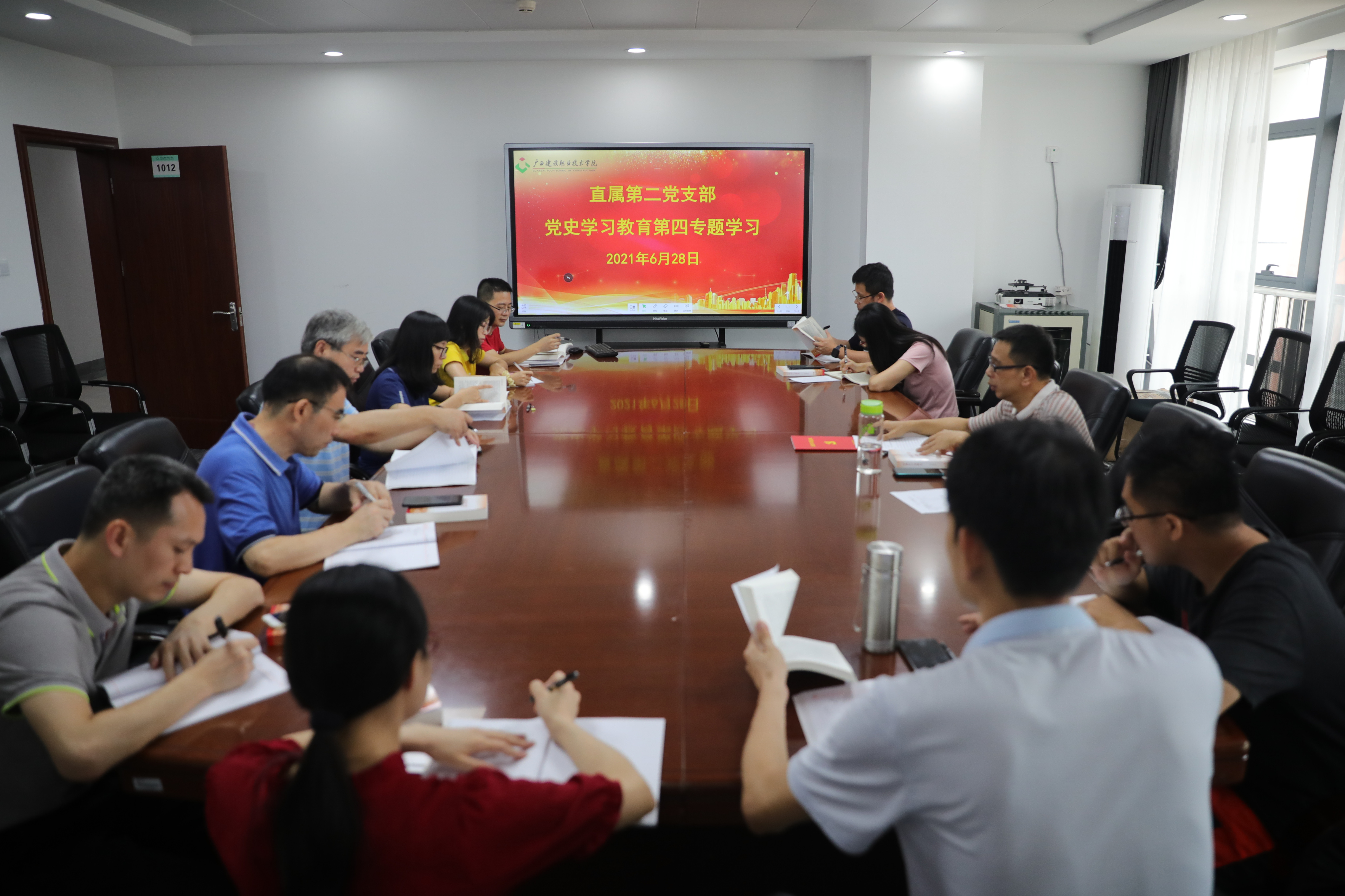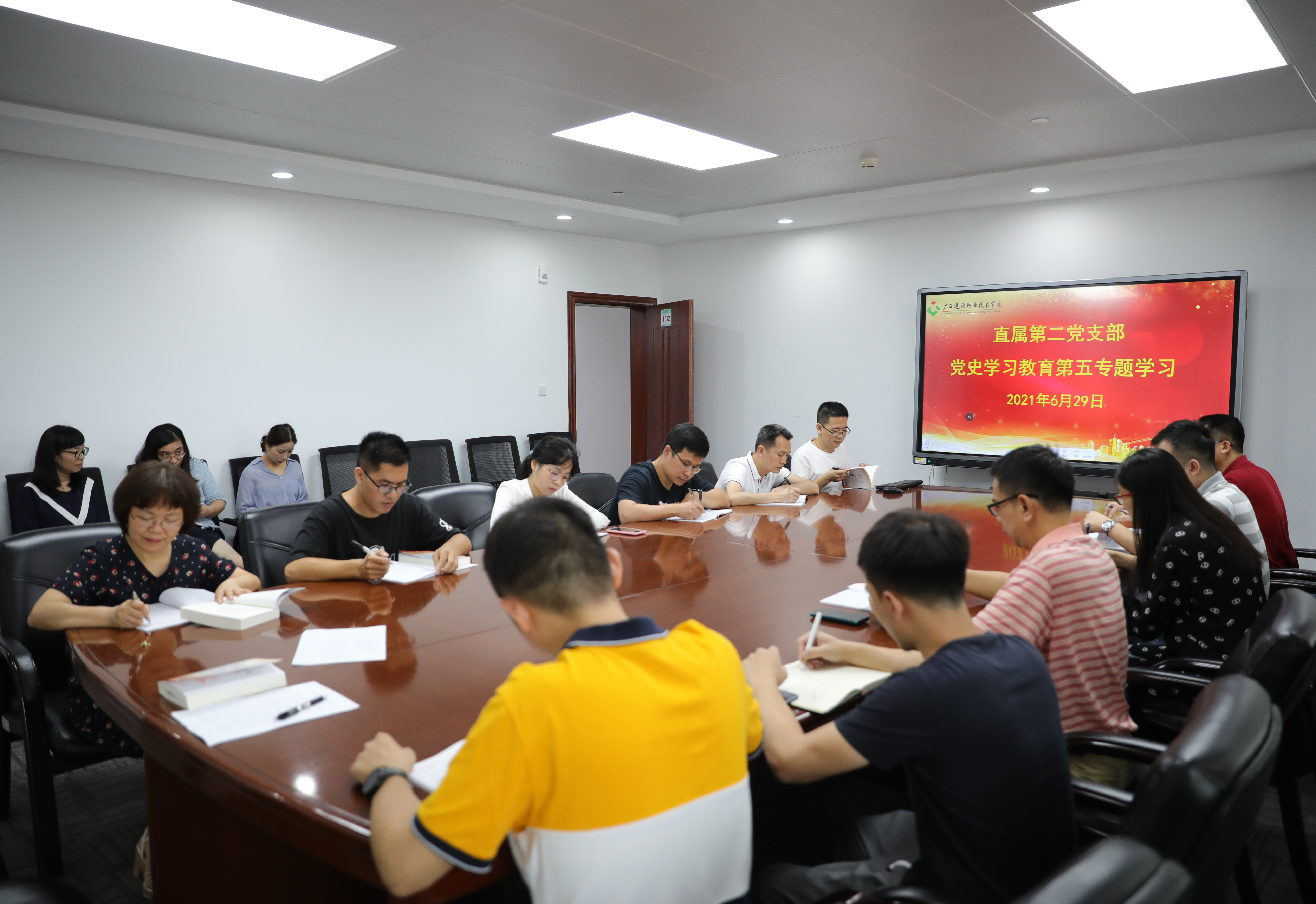 广西建院6月29日讯(党委宣传部 陈熙)6月29日,直属第二党支部在行政楼1012会议室开展了党史学习教育第五专题学习,支部书记庞松鹤主持学习会,支部全体党员参加学习。 会上,大家集中学习了《论中国共产党历史》《...