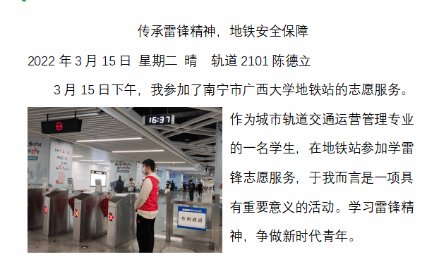 广西建院12月14日讯(市政与交通学院 韦玲玲)为不断丰富和发展新时期学雷锋活动的内涵和形式,市政学院团总支联合知行工作室于2022年3月—12月期间组织全体在校生开展了“‘志’青春——雷锋日记我们这样续写”...